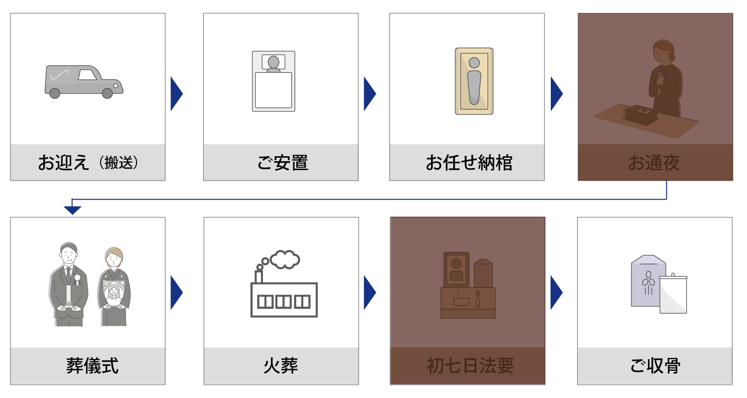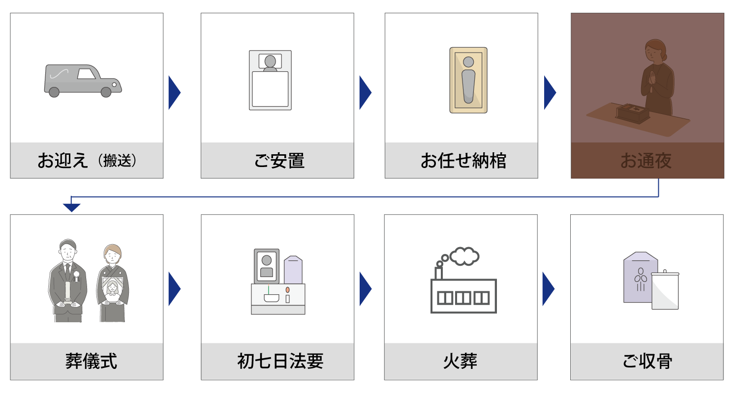 一日葬プランでは、病院等からのご遺体搬送、ご安置、お任せ納棺、葬儀が行えます。