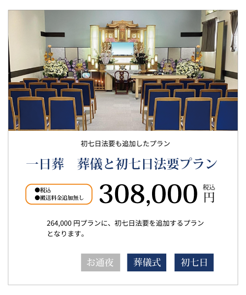 一日葬308,000円プランは、264,000円プランに初七日法要を追加したプランになります。